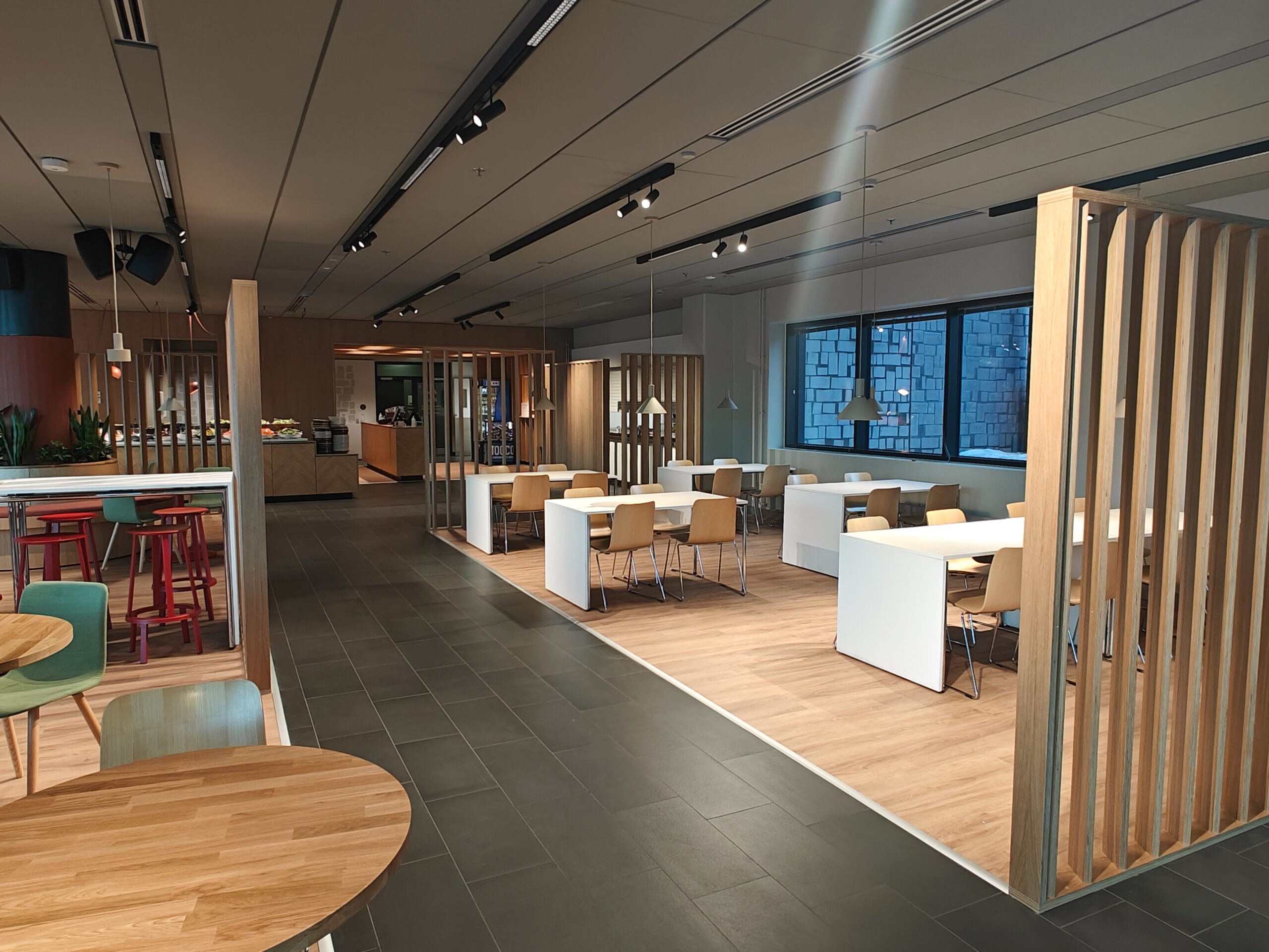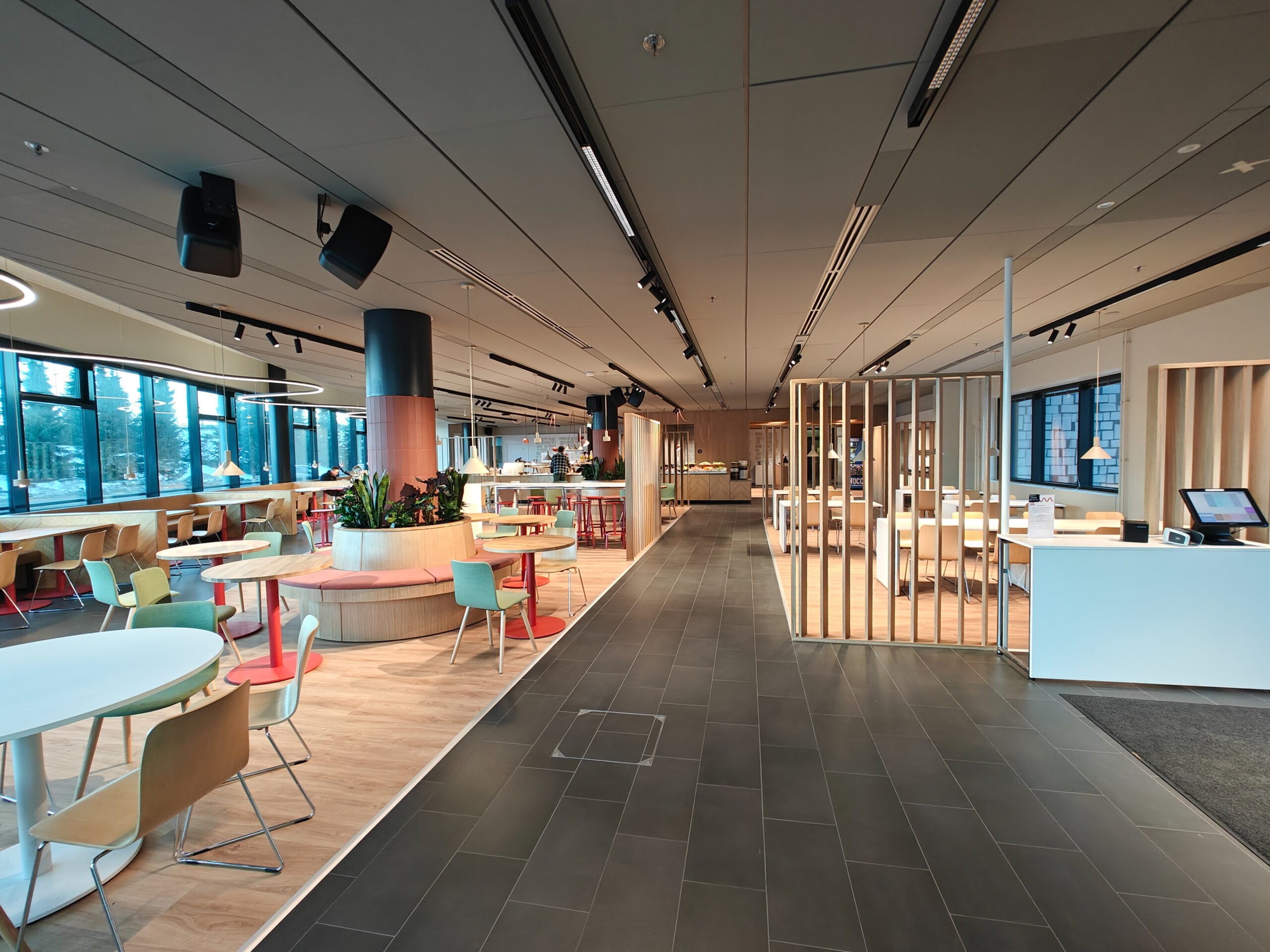 The warm atmosphere is created by Scandinavian wooden interiors, soft muted colors, and lush greenery. Large windows bring in natural light and offer a view of the bustling city, while the noise stays outside. The spacious event hall easily accommodates a dance floor and a live band. There is also an outdoor terrace available.