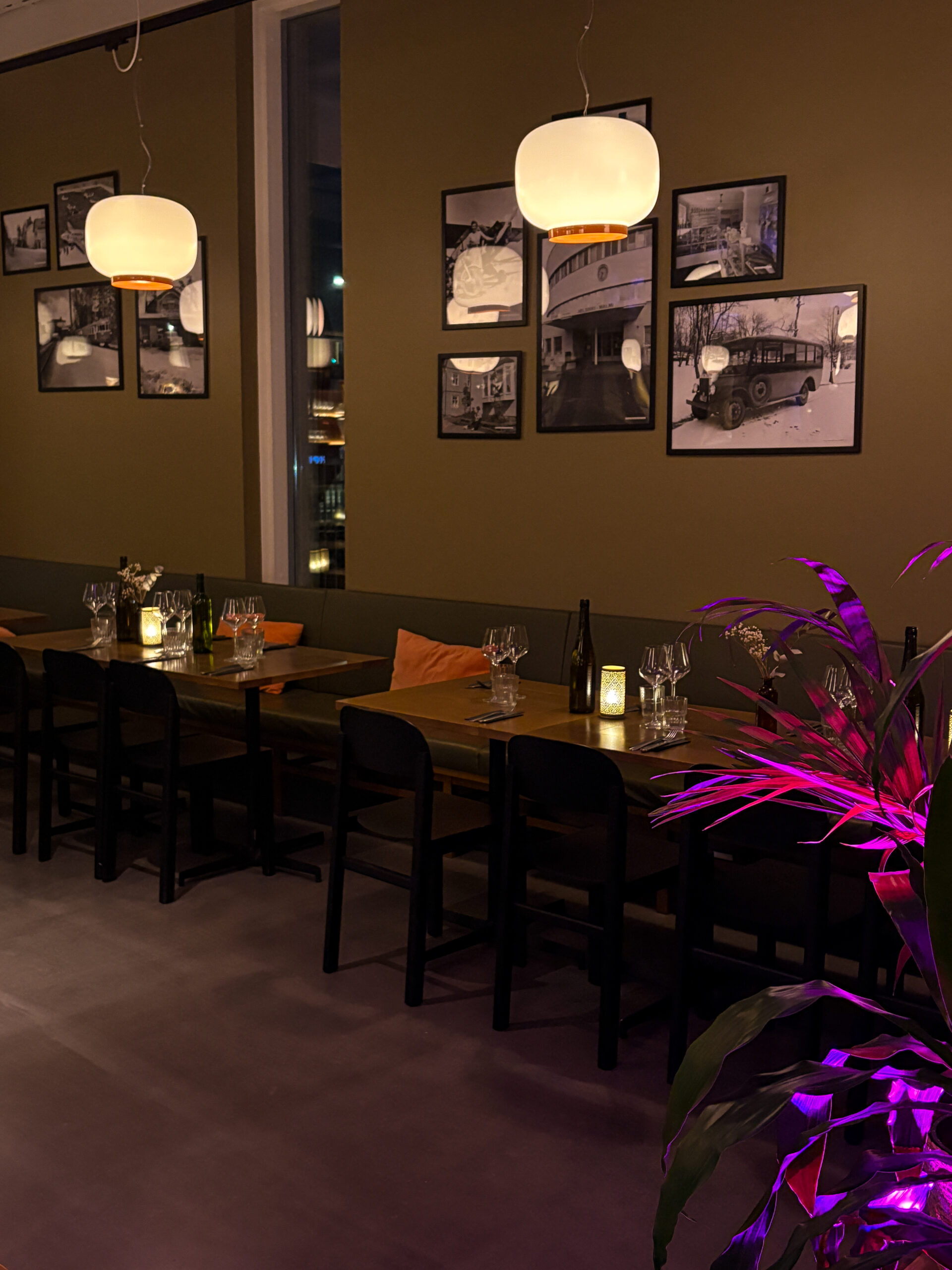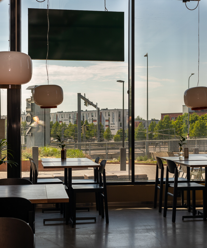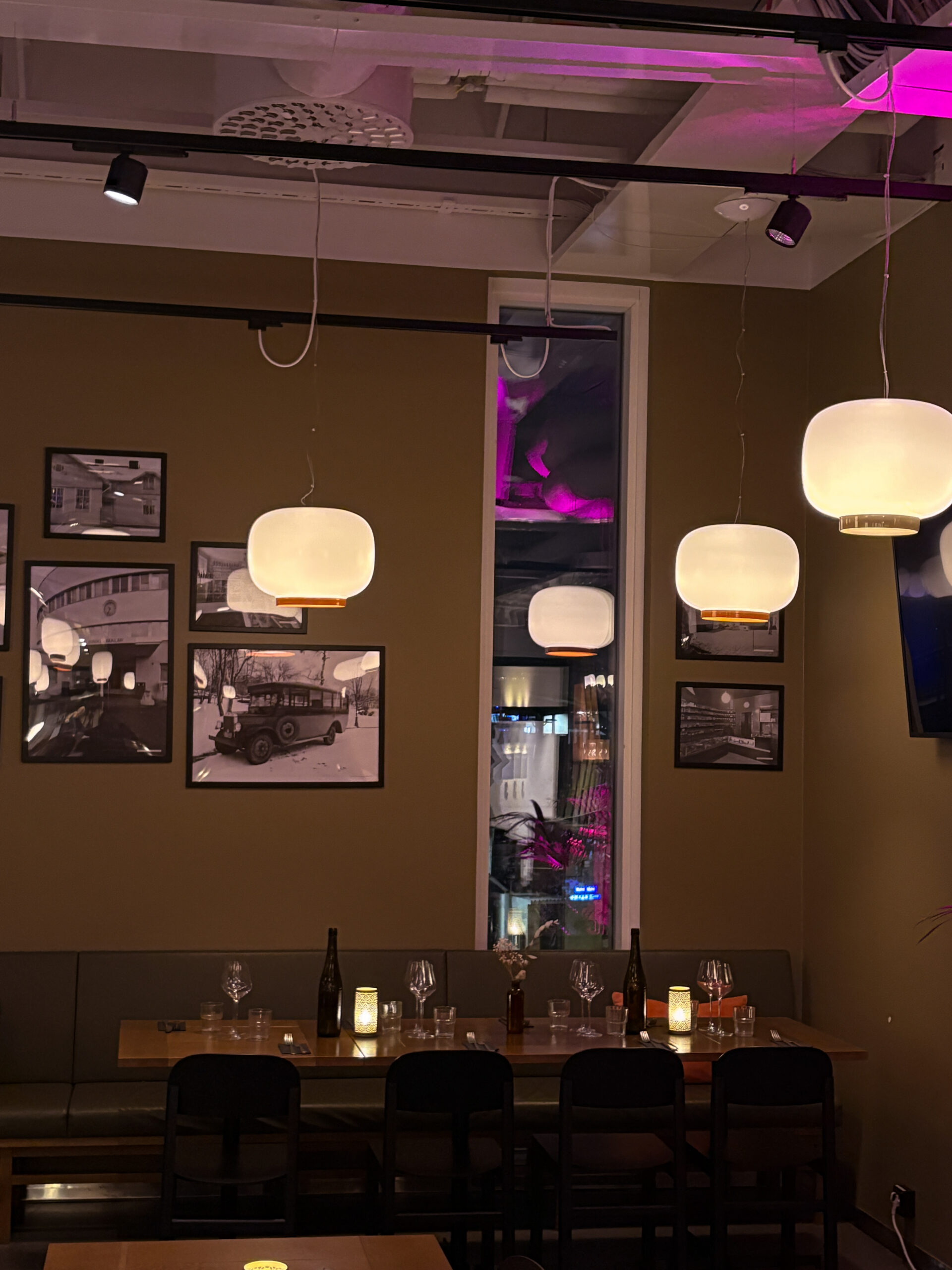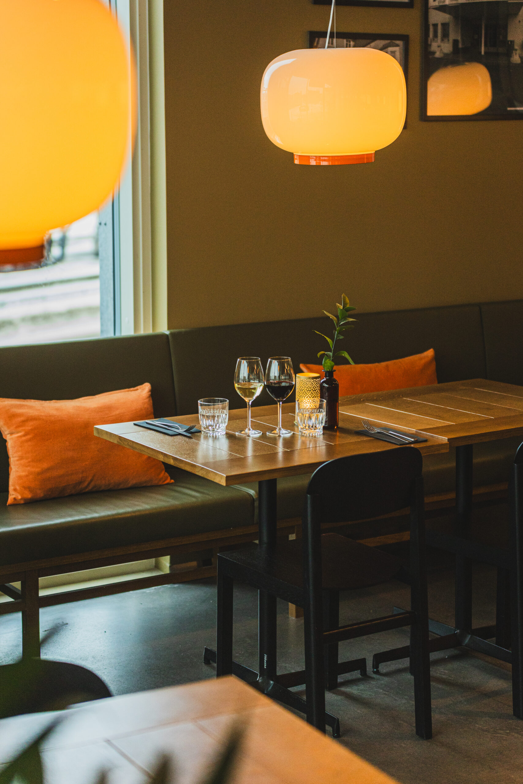 Ravintolan moderni puusisustus yhdistettynä pehmeään valaistukseen luo kutsuvan tunnelman. Suuret ikkunat tekevät ravintolasta valoisan ja tarjoavat näkymän terassille, jossa voi nauttia naapuruston sykkeestä ja seurata illan pimentymistä.