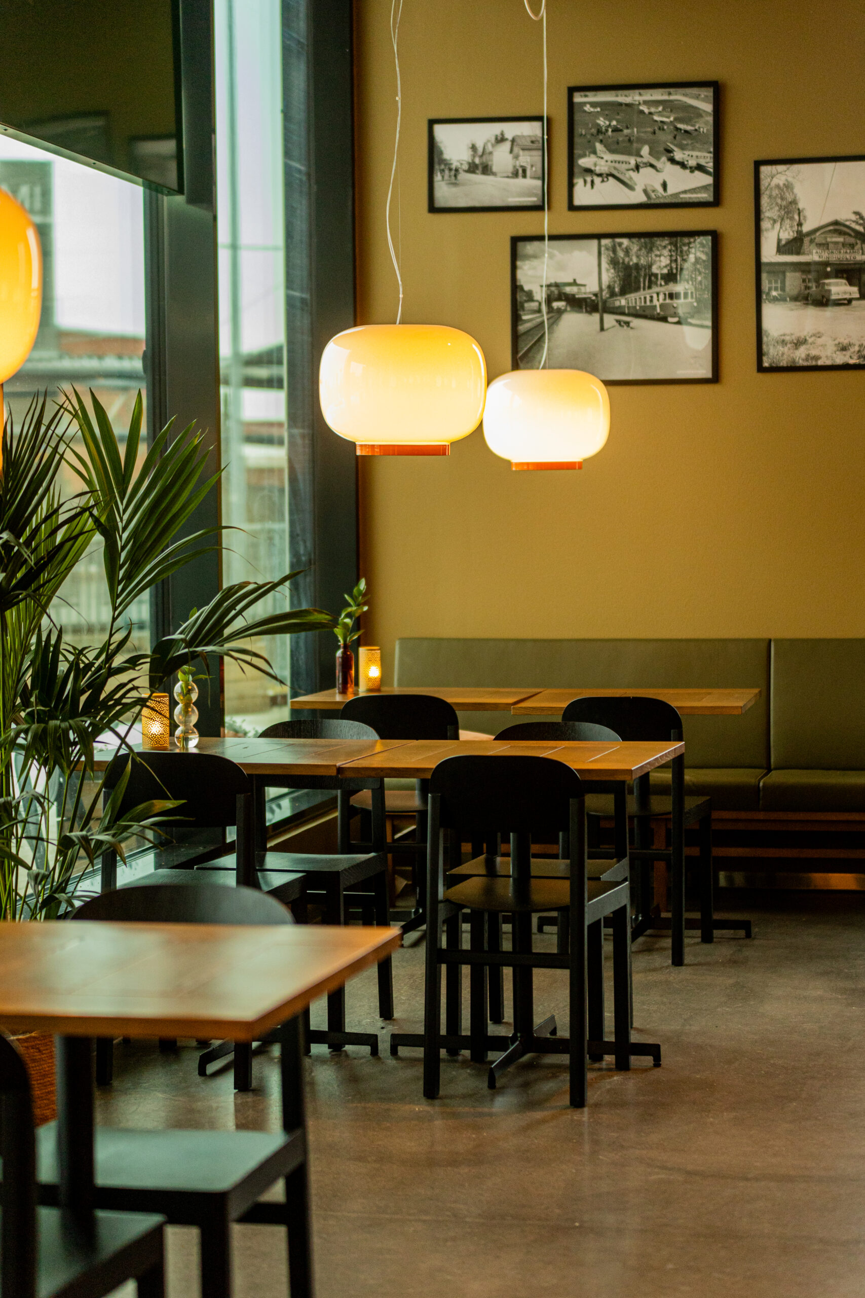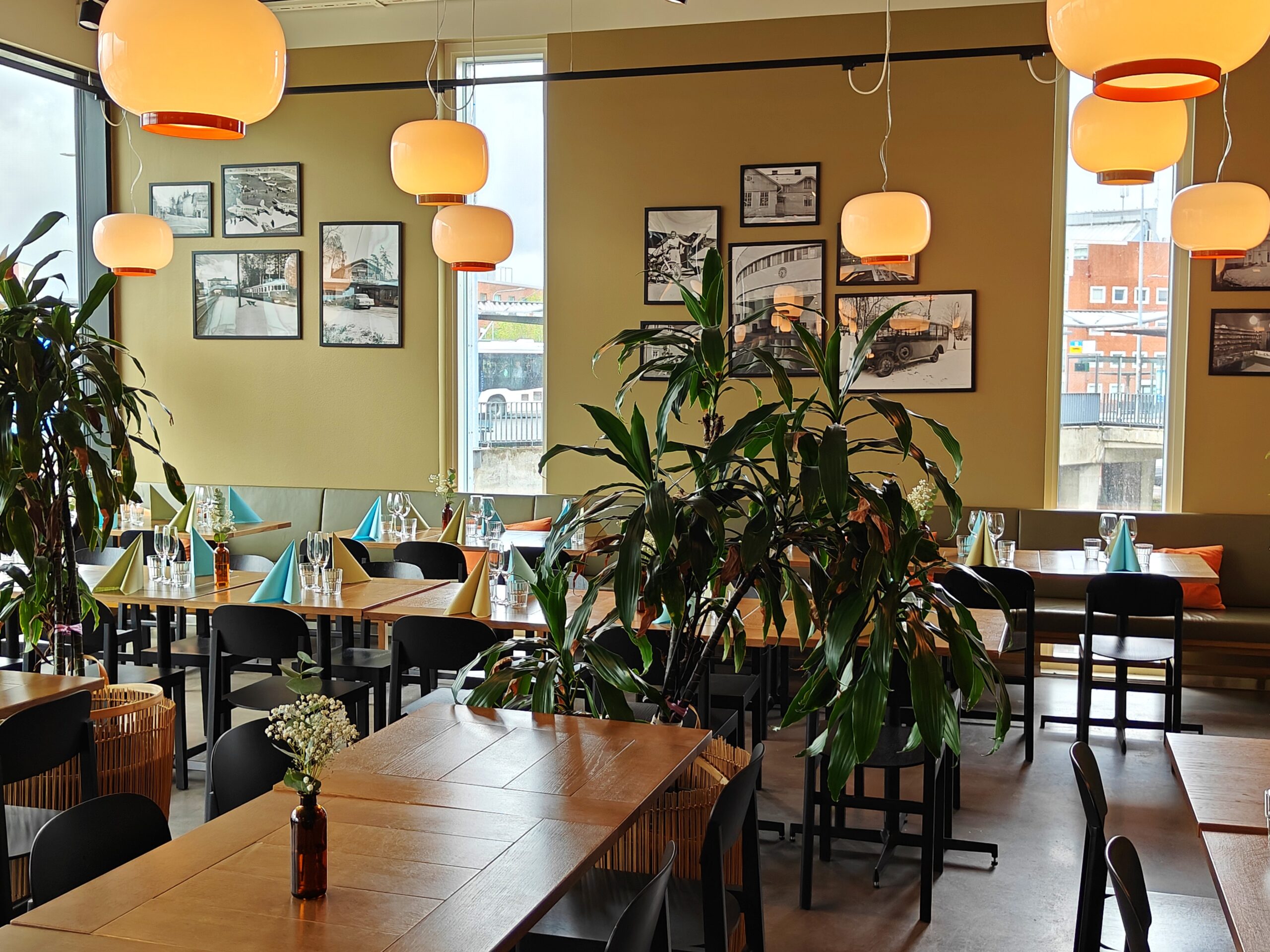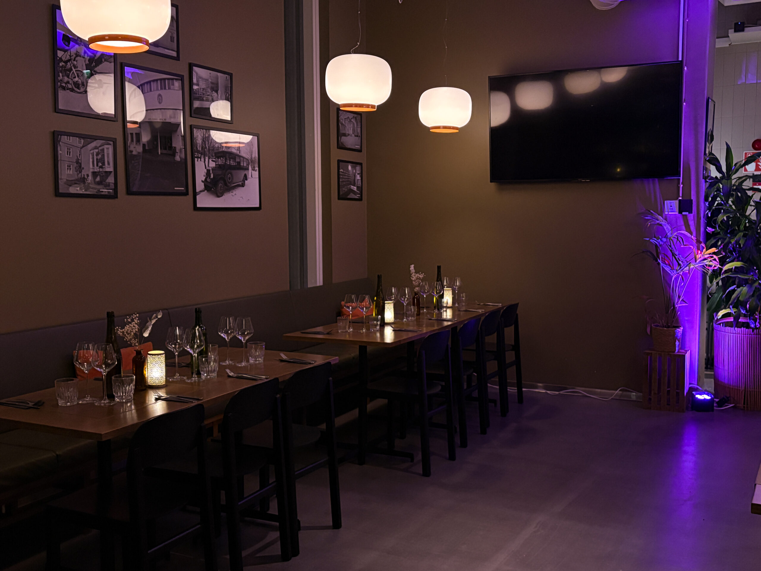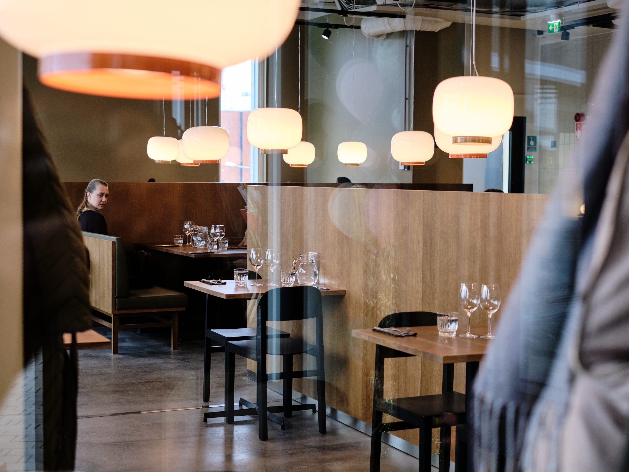 Ravintolan moderni puusisustus yhdistettynä pehmeään valaistukseen luo kutsuvan tunnelman. Suuret ikkunat tekevät ravintolasta valoisan ja tarjoavat näkymän terassille, jossa voi nauttia naapuruston sykkeestä ja seurata illan pimentymistä.