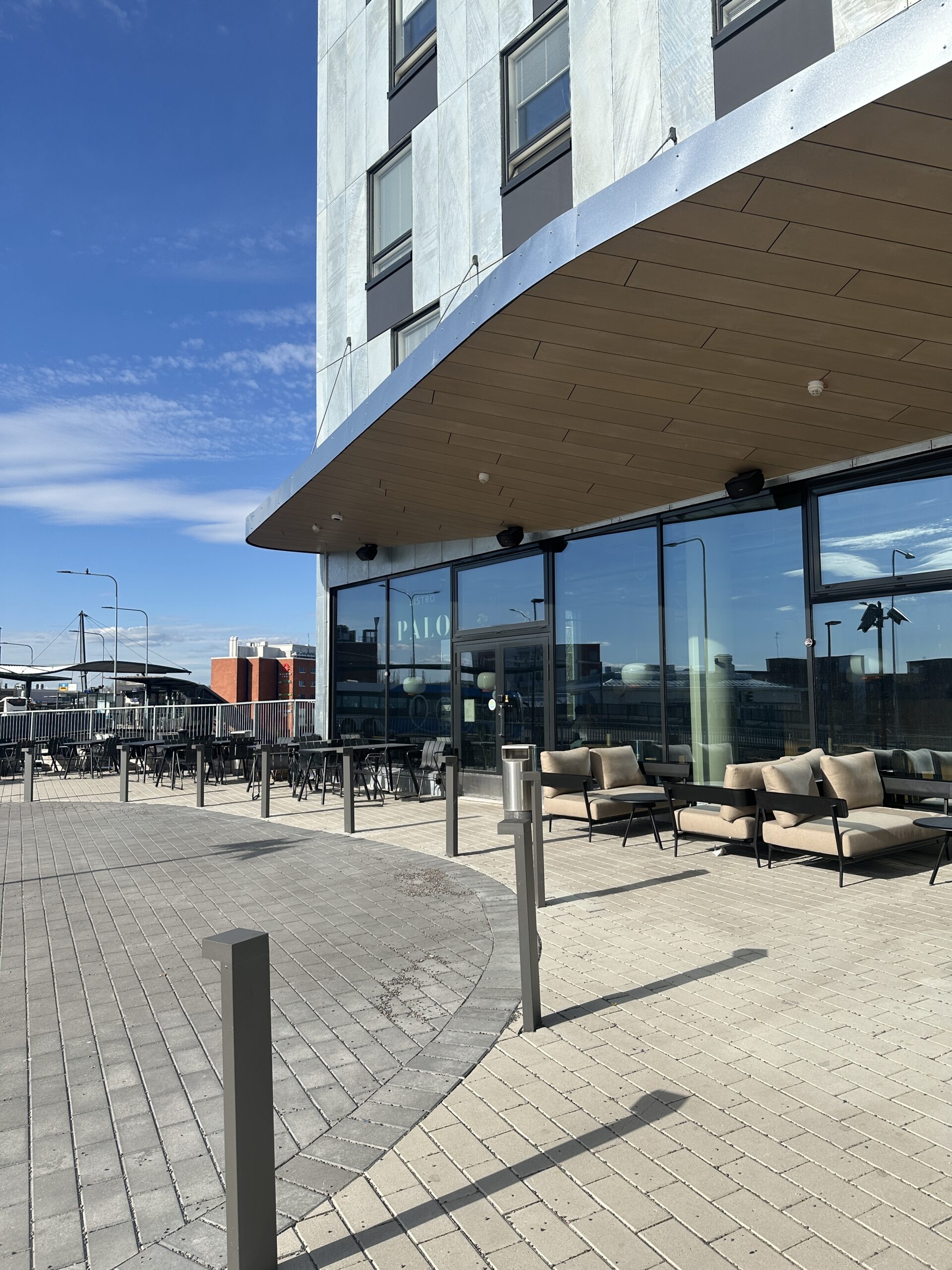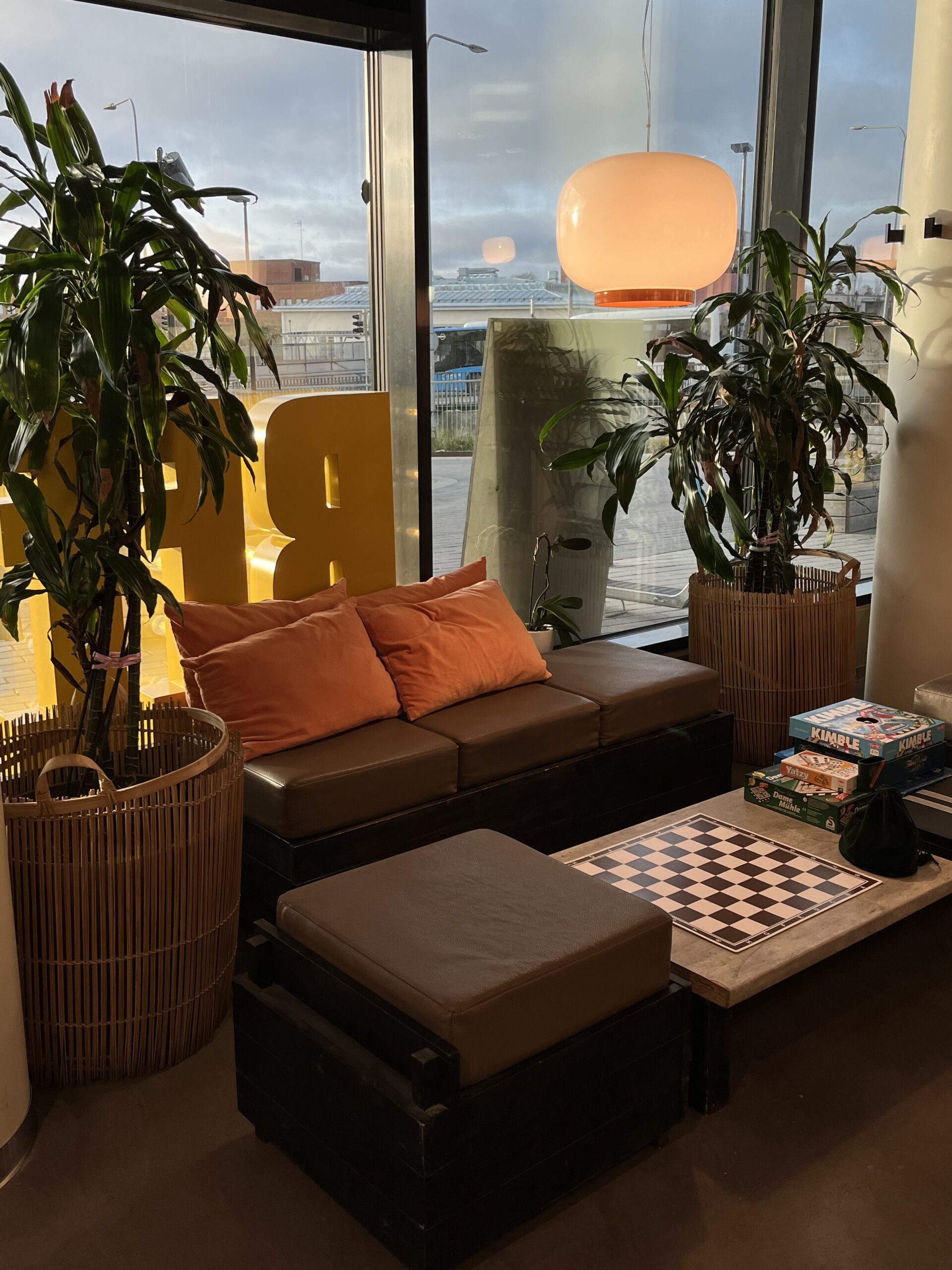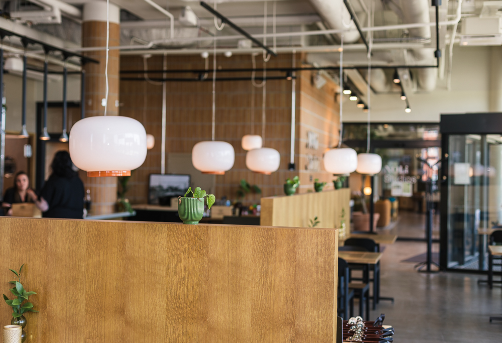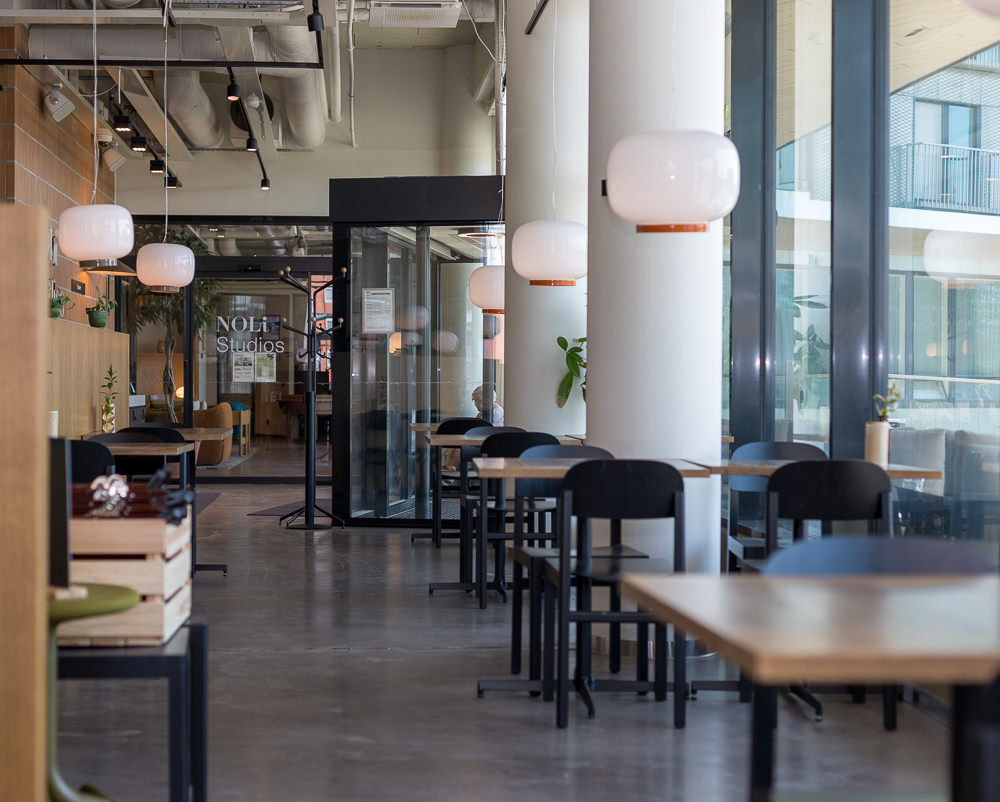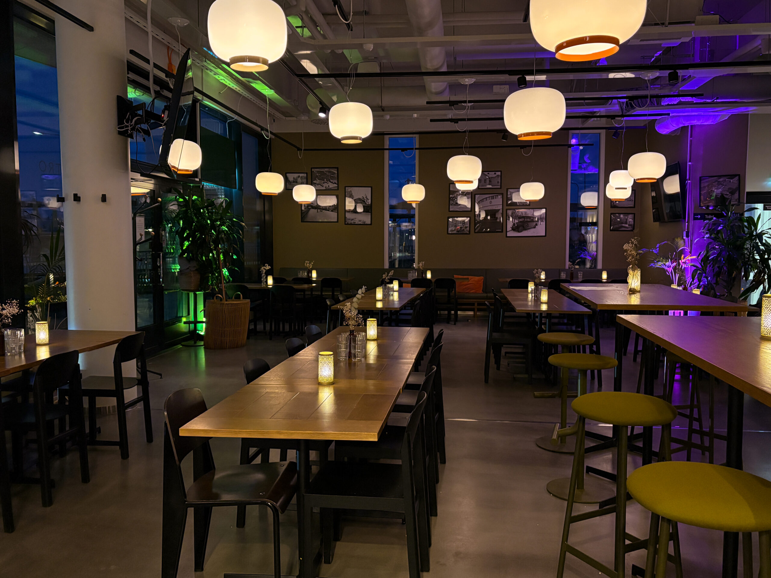 Ravintolan moderni puusisustus yhdistettynä pehmeään valaistukseen luo kutsuvan tunnelman. Suuret ikkunat tekevät ravintolasta valoisan ja tarjoavat näkymän terassille, jossa voi nauttia naapuruston sykkeestä ja seurata illan pimentymistä.
